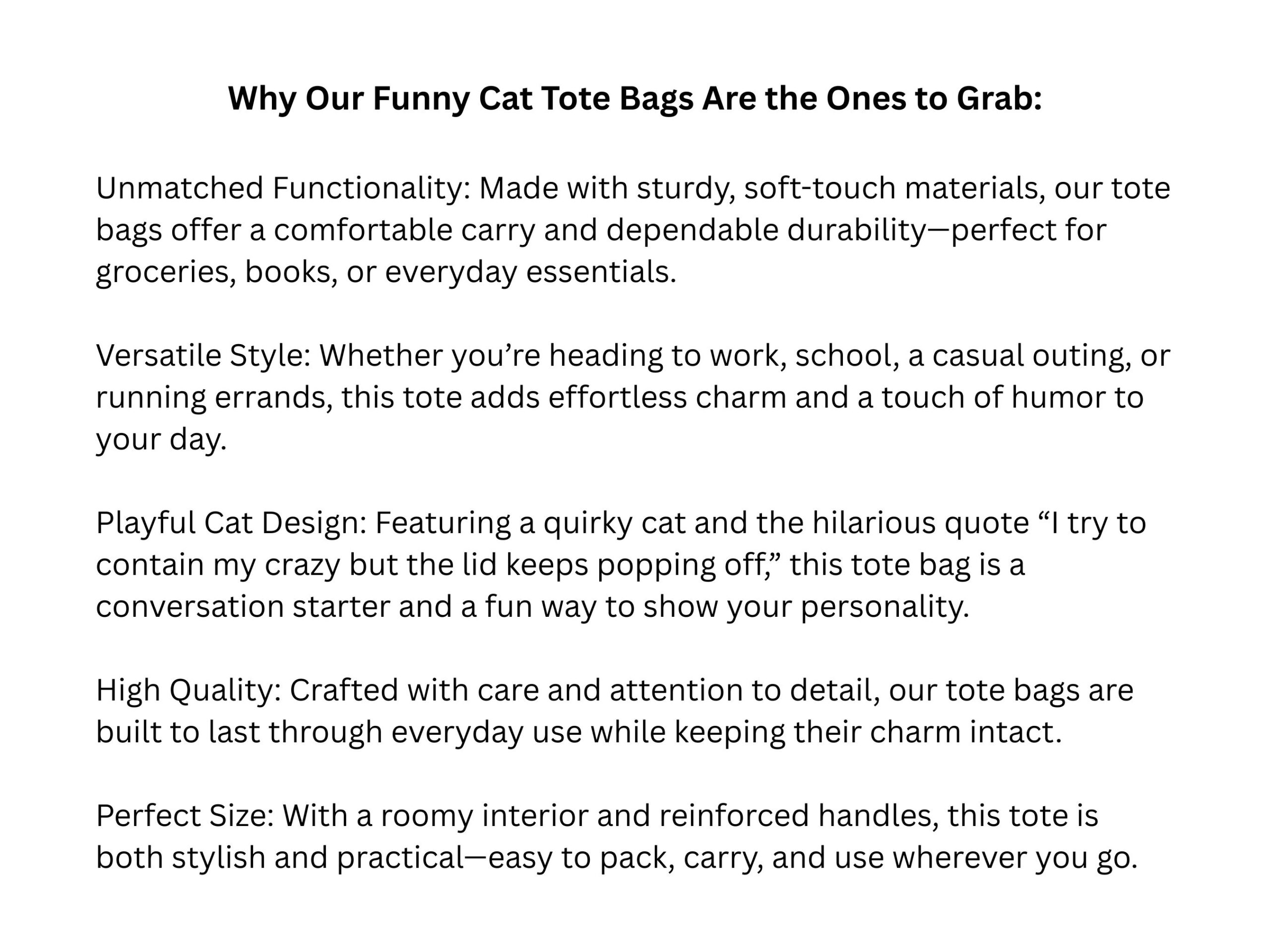 Funny Cat Tote Bag – Crazy Cat Quote “I Try to Contain My Crazy but the Lid Keeps Popping Off”