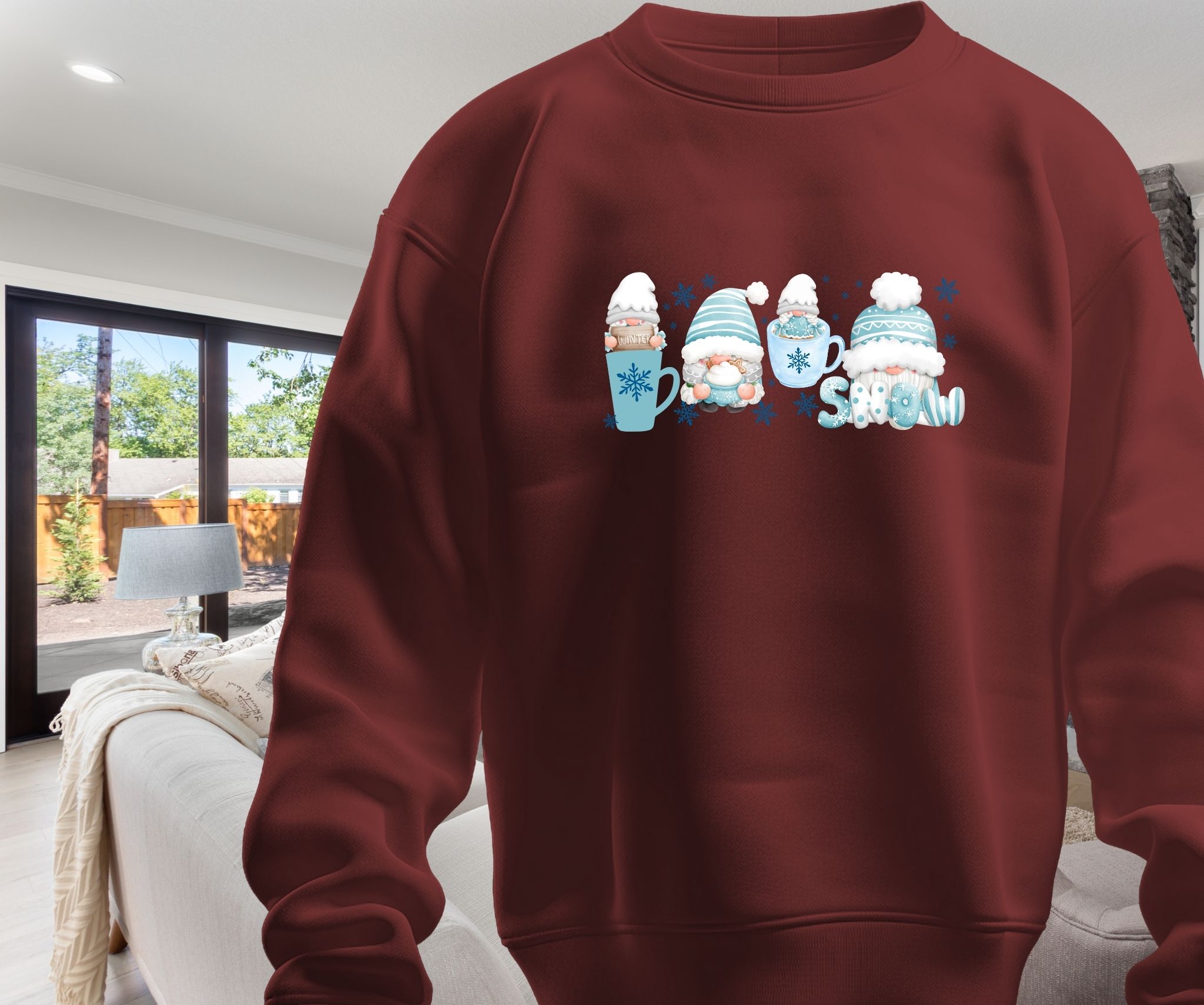 This exclusive sweatshirt design features four adorable gnomes: one nestled inside a coffee mug with the word Winter, one holding a steaming cup, another cozied up in a mug, and one surrounded by snow. Each detail is created to bring cheer, warmth, and personality to your everyday style.